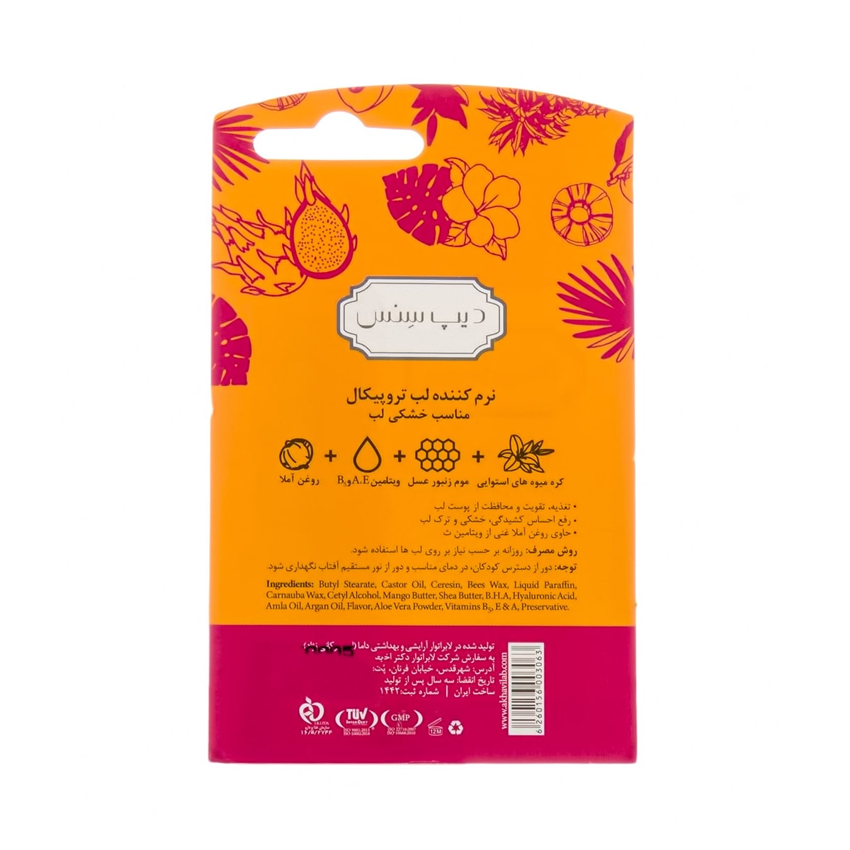 بالم لب دیپ سنس حاوی عصاره میوه های استوایی و ویتامین A و E